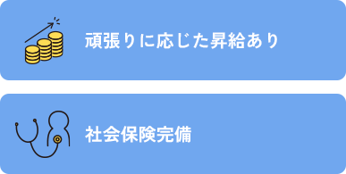 | 休日休暇 | ■日曜日・祝日 ■年末年始 ■ゴールデンウィーク ■その他希望休の取得も可能 ※要相談 |