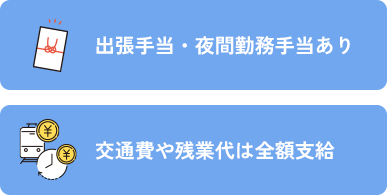 | 待遇/福利厚生 | ■昇給あり ■社会保険完備 ■出張手当・夜間手当あり ■残業代支給 ■資格取得支援(費用負担) ■交通費全額支給 ■マイカー通勤OK |